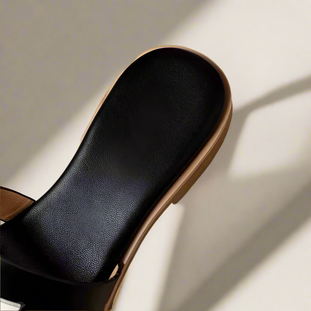 Transform your outfit into a timeless, chic ensemble with Siya Black Mule Flats. Made from genuine leather, these mules boast a luxurious experience from the moment you slip them on. The leather lining and insole ensure long-lasting comfort, while the rubber outsole offers durability and unbeatable traction. Whether you're hitting the town or just lounging at home, these stylish slides exude elegance and sophistication with every step. Available in sizes 3-6 SA/UK.