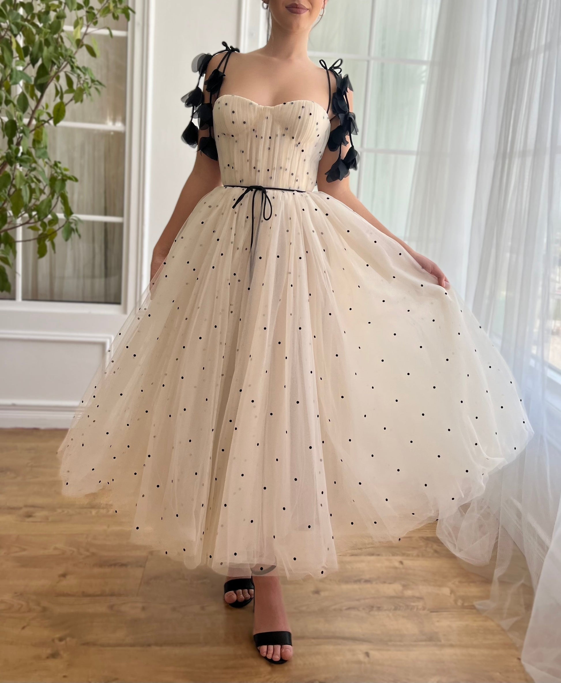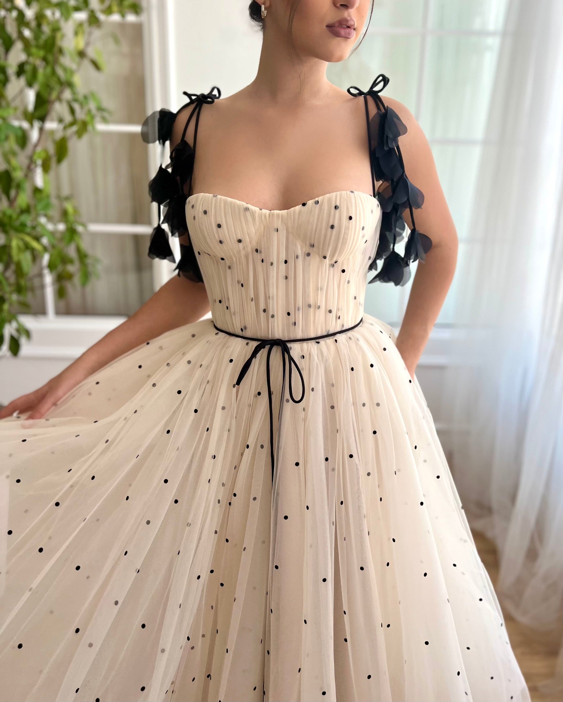 Step into the spotlight with this creamy-colored dress, beautifully constructed from high-quality tulle adorned with polka dot details. The fitted bodice features structured boning and artful draping that enhances your silhouette, while a romantic lace-up back and a flowing midi-length skirt provide a striking look with ample volume. Practical elements like inseam pockets merge convenience with style. Floral appliqué straps and a decorative ribbon bow belt add a touch of whimsy. Perfect for weddings, garden parties, and formal events, this dress is designed to make a memorable impression at any sophisticated gathering.