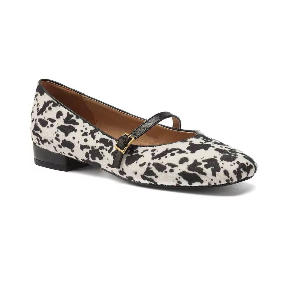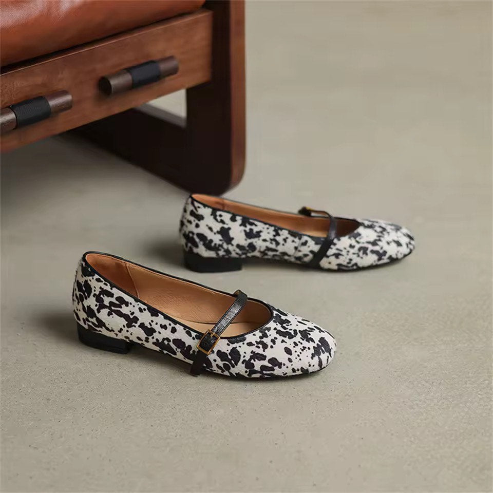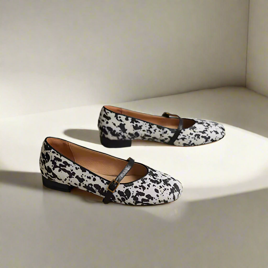 Indulge in the luxurious comfort of Chloe White Animal Print Ballet Flats. Made from premium upper horse hair and genuine leather components, these classy flats feature a crossover strap and side buckle for a refined touch. They are the perfect addition to your elegant wardrobe.