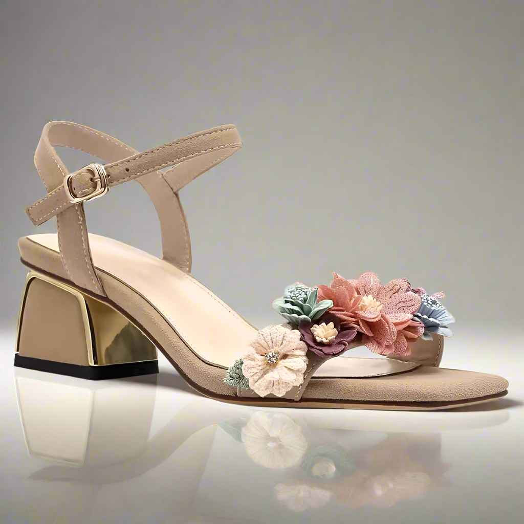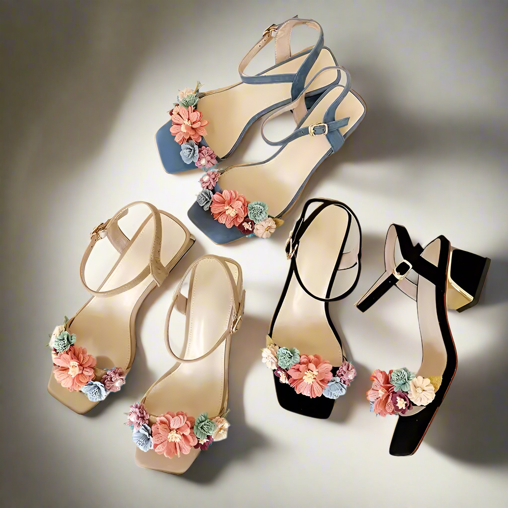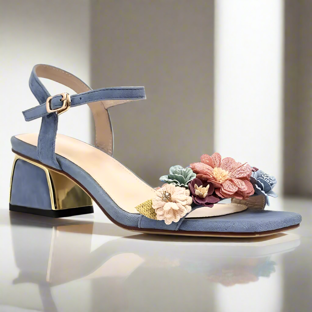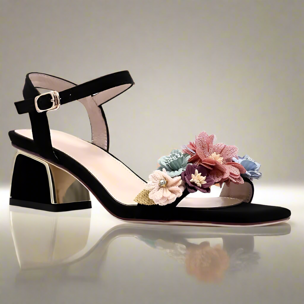 This fashionable sandal features a durable and high-quality upper flock leather, genuine leather lining, and rubber outsole. With a comfortable square heel measuring at 4.5 cm, it's perfect for all-day wear. The beautiful flower embellishment comes in three unique color options: blue, black, and beige.
