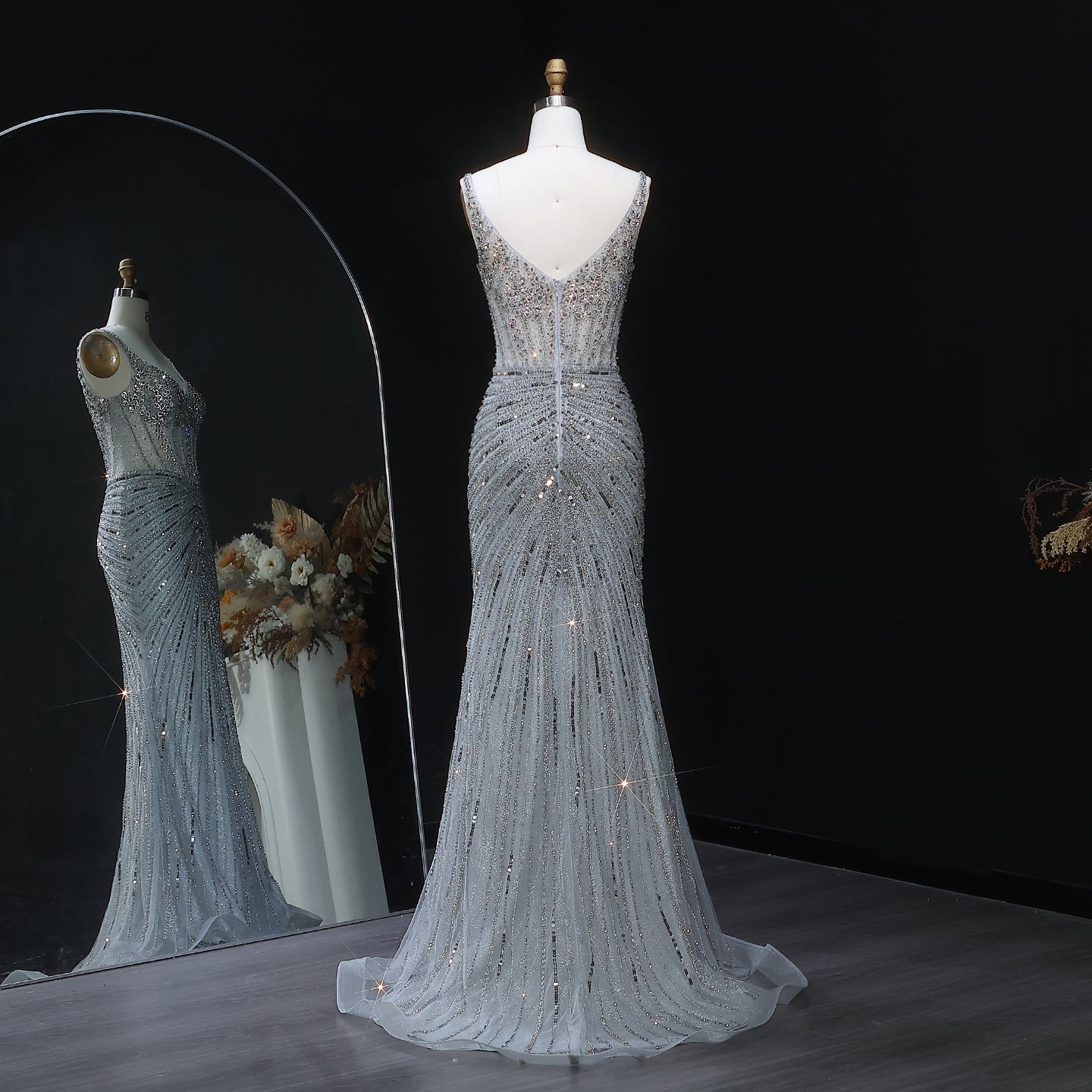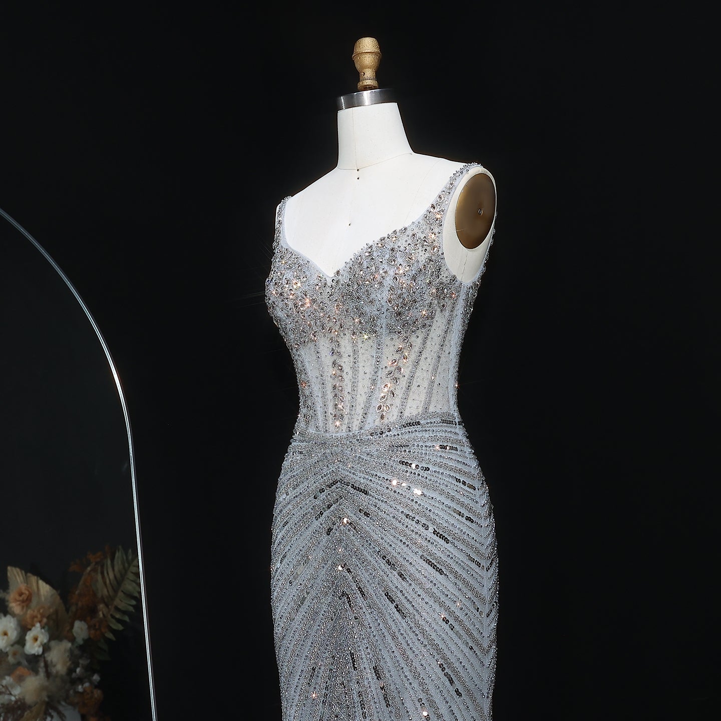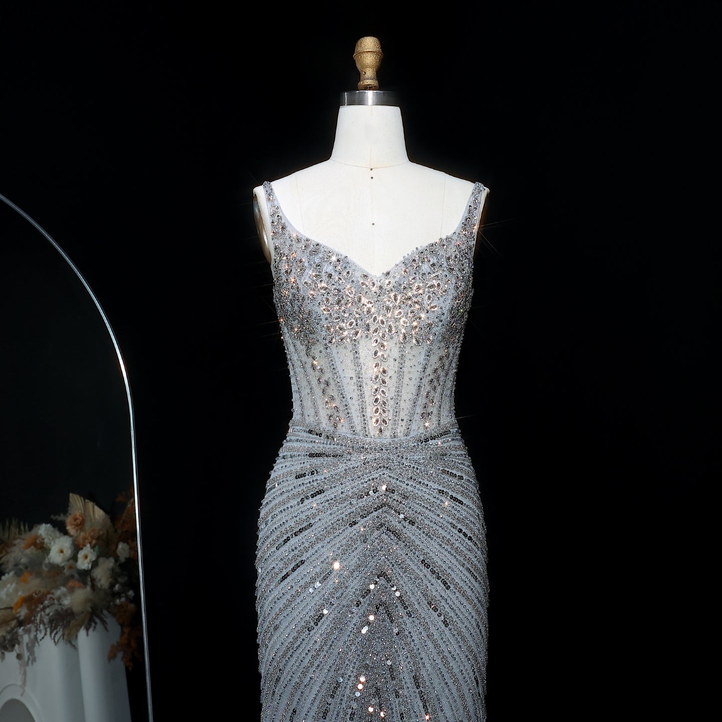 Leena Silver Beaded Spaghetti Straps Mermaid Dress