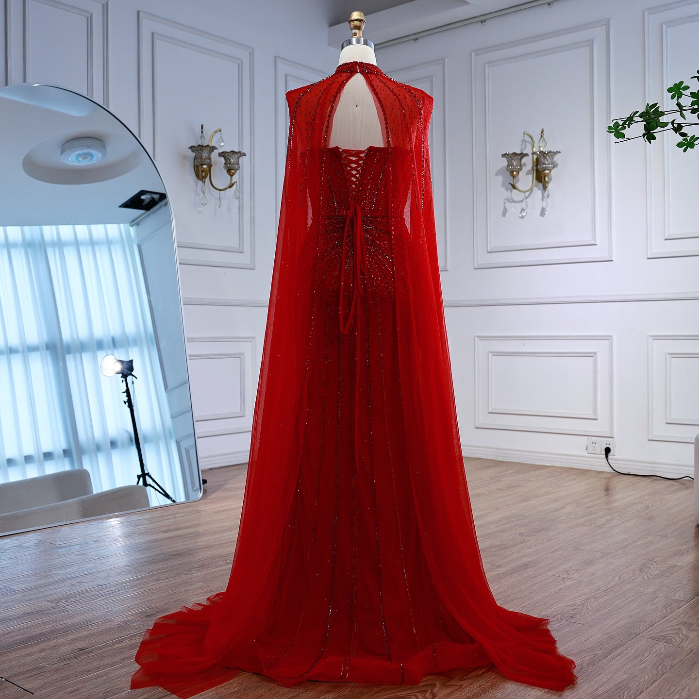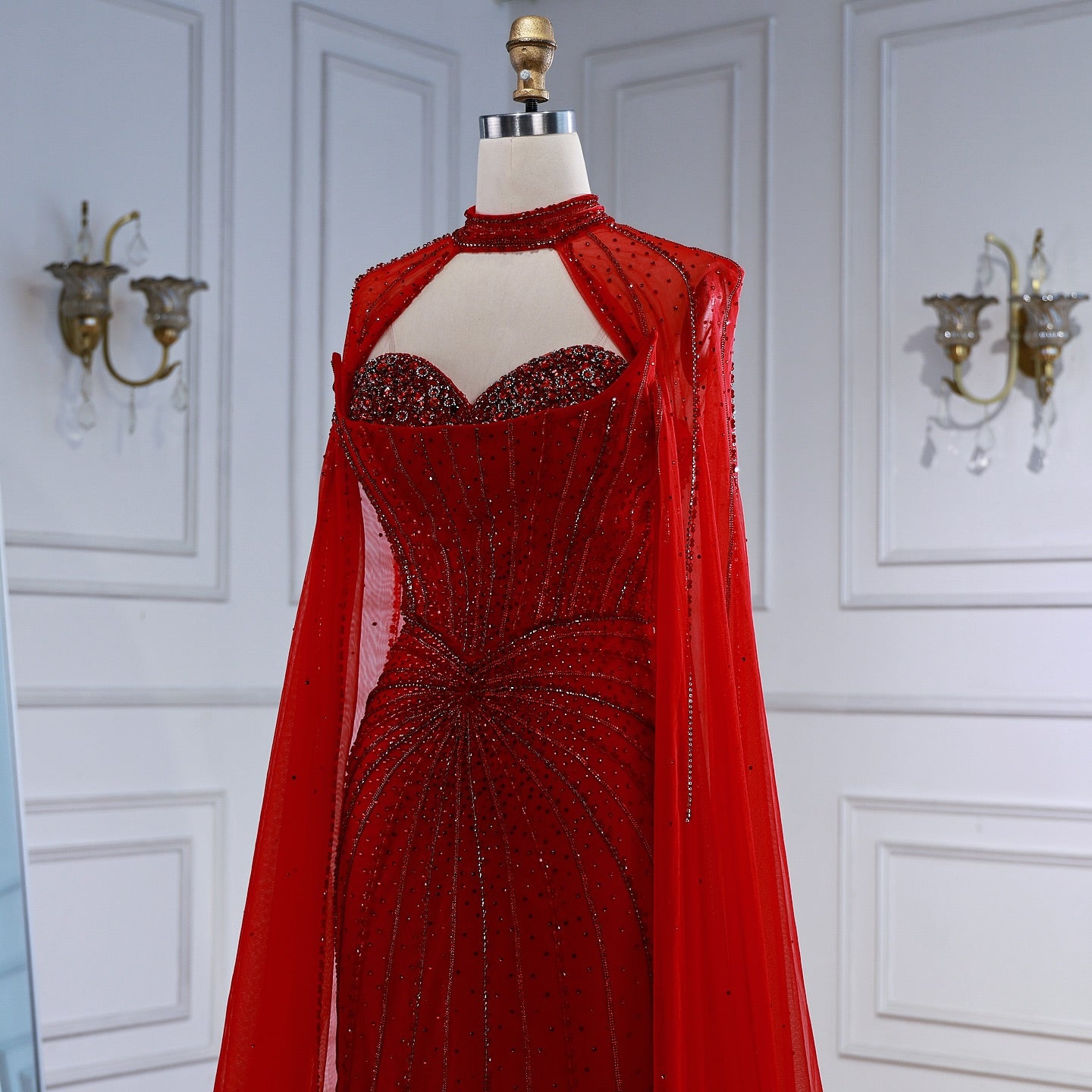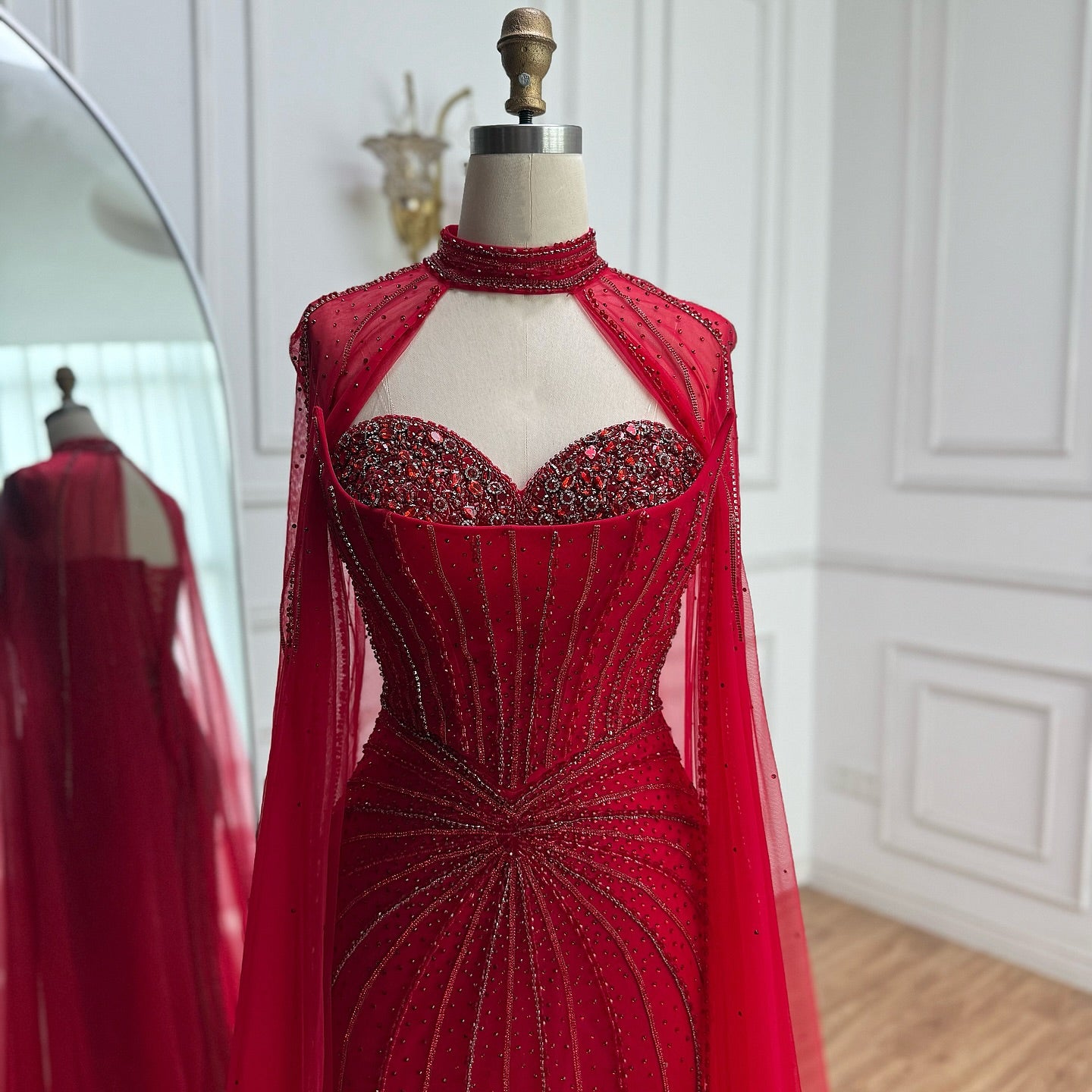 Ruby Vered Red Beaded Mermaid Cape Sleeves Evening Dress