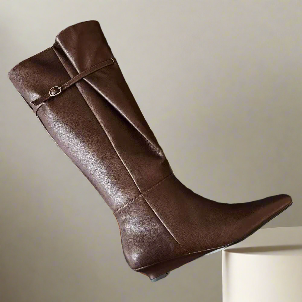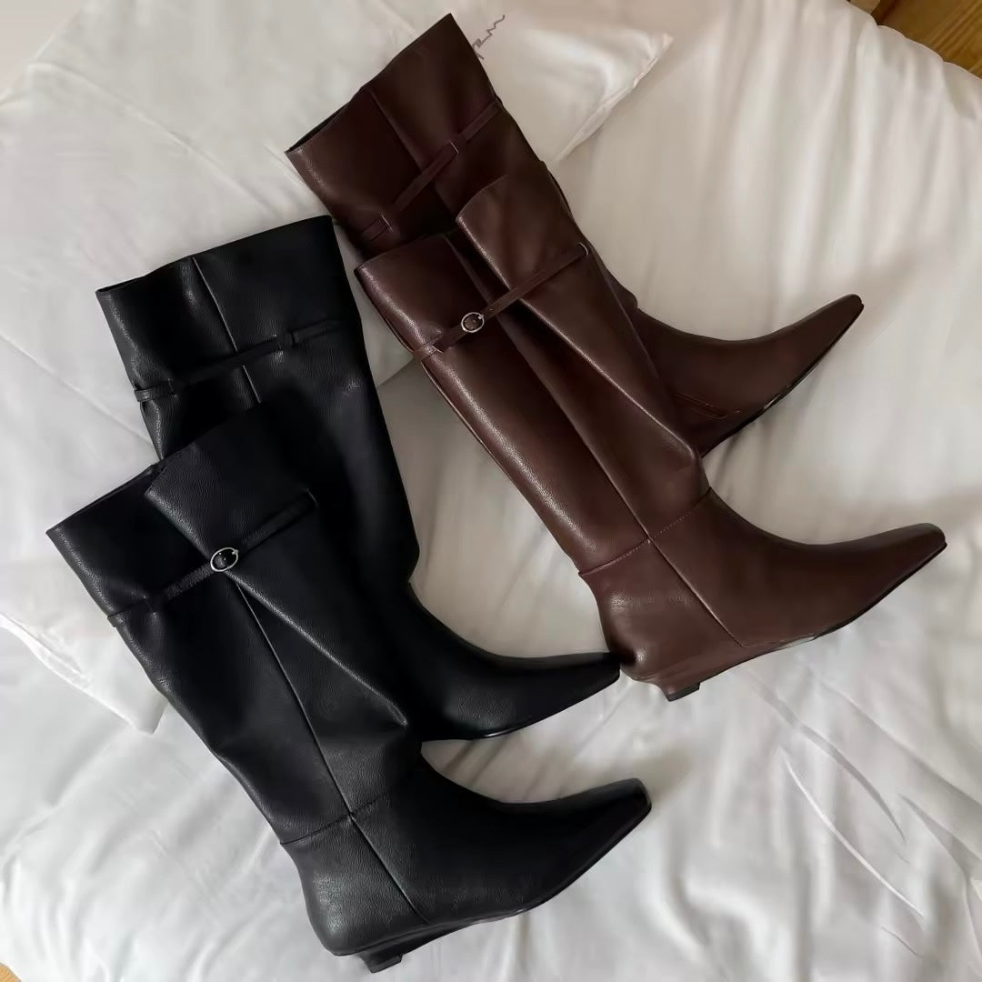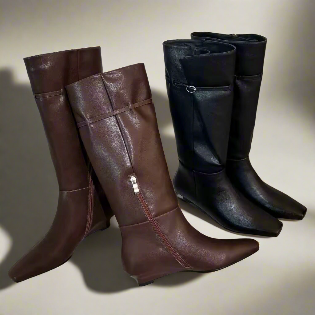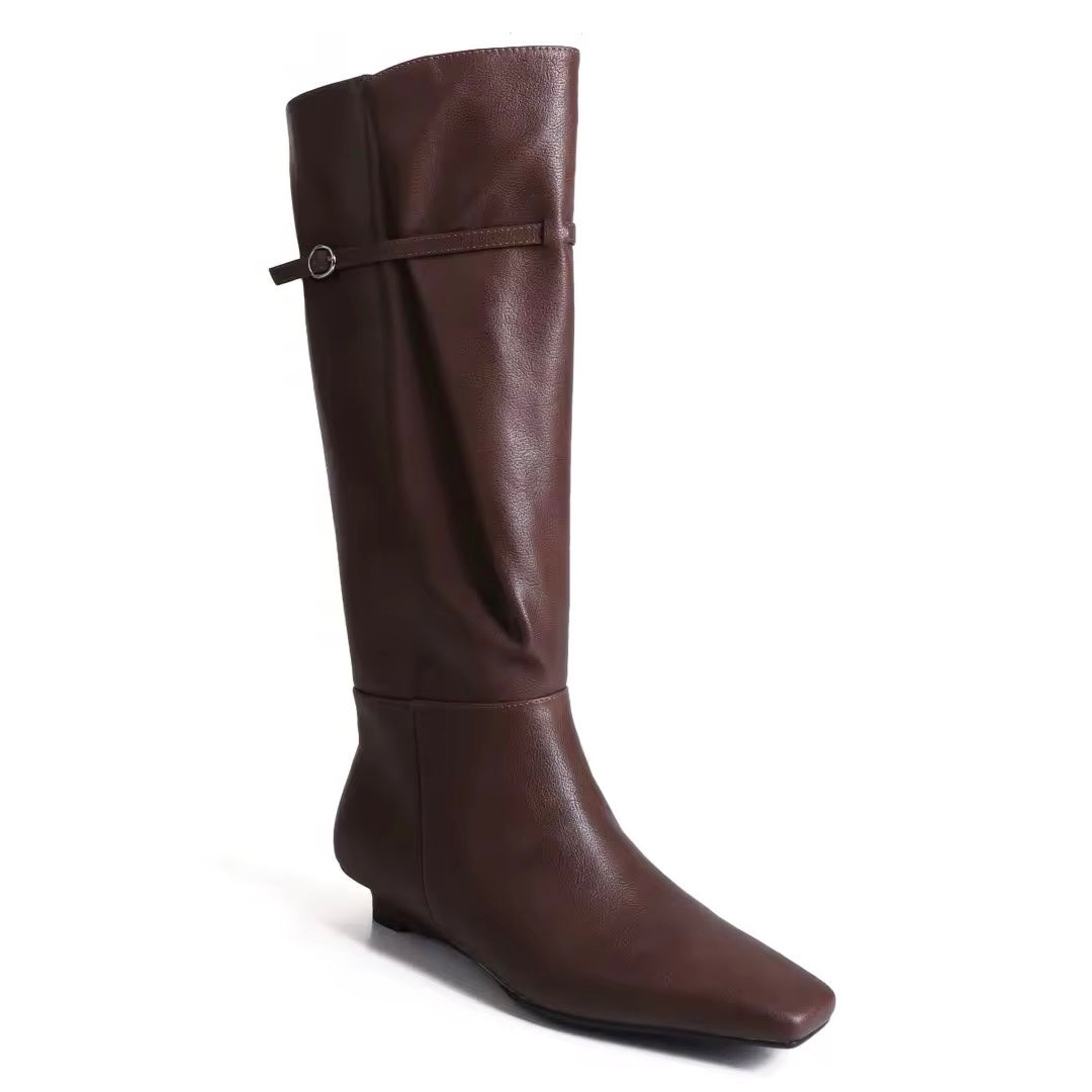 SHOPWGP Victoria Brown Square Toe Wedge Knee High Boots
